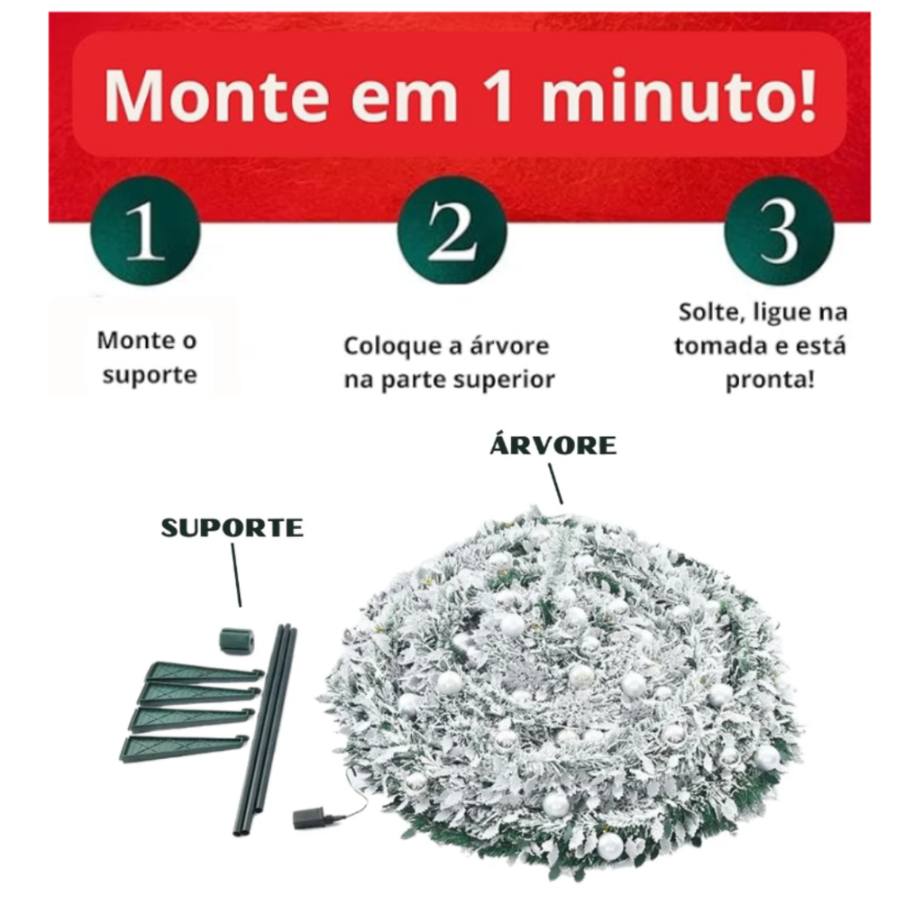 O grande diferencial deste modelo é a montagem rápida em apenas 3 passos: monte o suporte, encaixe a árvore e solte — ela se abre automaticamente, ficando pronta para decorar em segundos.