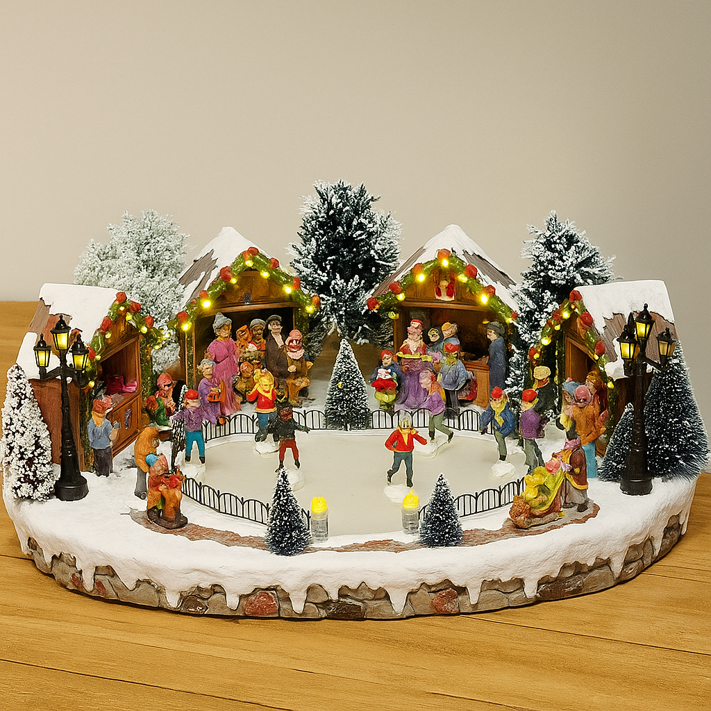 Produzido em resina e plástico, o cenário apresenta personagens em uma pista de patinação, criando uma atmosfera festiva e acolhedora, perfeita para compor vilas natalinas, aparadores, mesas decoradas e vitrines temáticas.