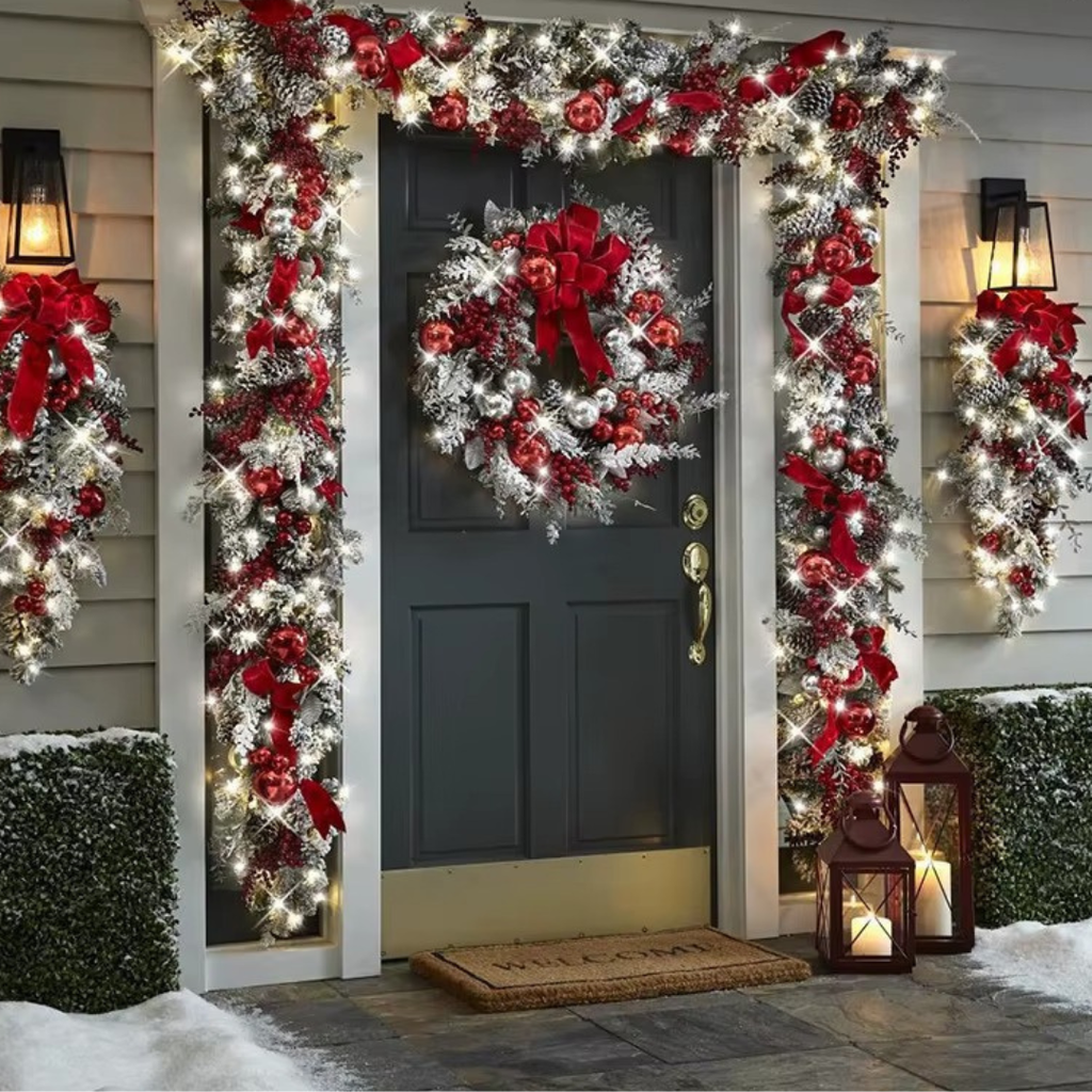 Transforme a entrada da sua casa em um verdadeiro cenário natalino de luxo com a Fachada Natalina Premium Completa, composta por guirlanda, cascatas decorativas e moldura superior flocada.