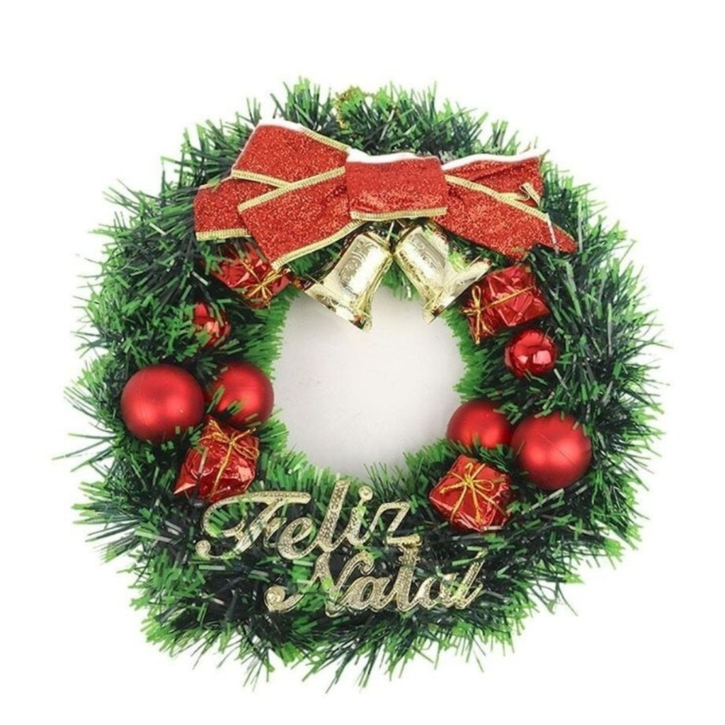 Guirlanda Natalina Decorada 28 cm – Laços, Presentes, Bolas e Placa “Feliz Natal”