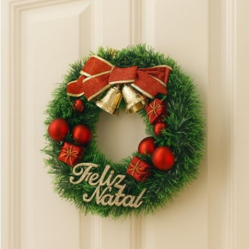 Composta por laço vermelho clássico, bolas decorativas, mini presentes dourados e vermelhos e a mensagem “Feliz Natal” em destaque, ela cria uma recepção calorosa e festiva para qualquer ambiente.